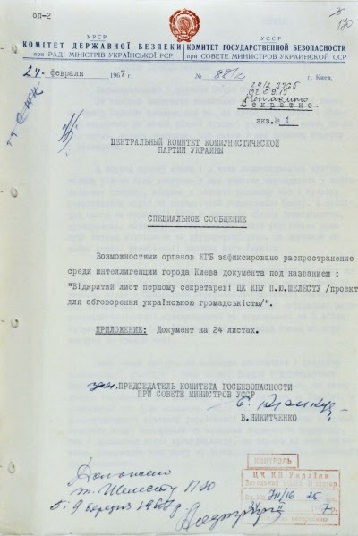 24 февраля 1967 года КГБ УССР специальным сообщением информировал ЦК Компартии Украины о том, что среди интеллигенции города Киева зафиксировано распространение документа «Открытое письмо первому секретарю ЦК КПУ П. Е. Шелесту (проект для обсуждения украинской общественностью)». Ирония момента в том, что именно благодаря КГБ это письмо получило характер «открытого» и стало известно П. Шелесту, которому докладывали о нем дважды 5 и 9 марта, о чем есть отметка в документе [21].