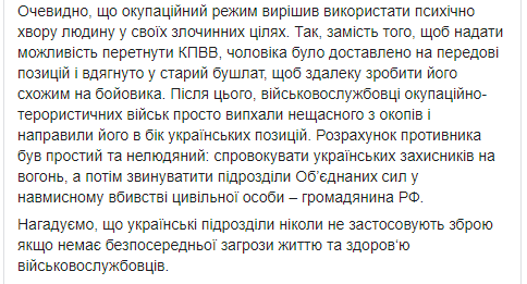 «Вместо того, чтобы предоставить возможность пересечь КПВВ, мужчина был доставлен на передовые позиции и одет в старый бушлат, чтобы издалека сделать его похожим на боевика. После этого, военнослужащие НВФ просто выпихнули несчастного из окопов и направили его в сторону украинских позиций. Расчет противника был прост и бесчеловечен: спровоцировать украинских защитников на огонь, а затем обвинить подразделения Объединенных сил в преднамеренном убийстве гражданского лица — гражданина РФ».