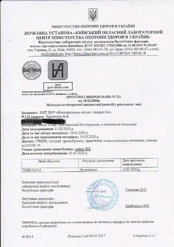 Лидер группы «Друга ріка» Валерий Харчишин, который проходит лечение в частной клинике от пневмонии, заверил, что у него нет коронавируса и опубликовал результаты теста на COVID-19.