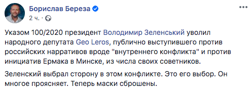 Он назвал "признанием террористов и сдачей национальный интересов" соглашение, которое было подписано ОП и Кремлем в Минске. Гео Лерос, комментируя свое увольнение, написал в Facebook: "Вижу, что Ермак (глава ОП - ред.) прочитал мое интервью".