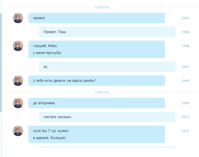 Но вот буквально на днях ещё один из моих контактов, с которым я также давно не переписывался, неожиданно написал и… да, попросил дать взаймы несколько тысяч. На этот раз я, конечно же, всё понял с первых двух фраз, но решил не убивать интригу, а немного развлечься. Впрочем, ничего забавного из этого не вышло. Мне было интересно, что будет делать мошенник, когда обнаружит, что на его счёт ничего не пришло, хотя жертва перевод подтвердила. На деле же оказалось, что человек с той стороны не всегда может проверить счёт, на который просит кинуть деньги.