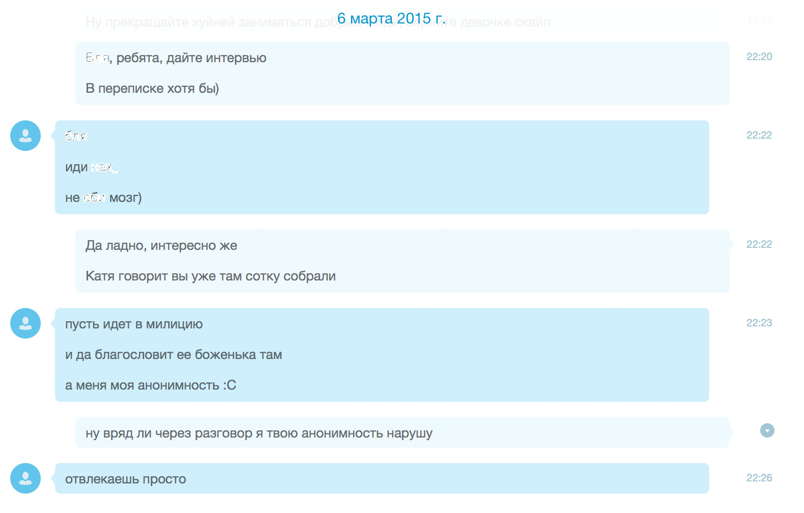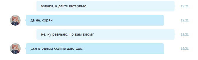 Не успел, к сожалению, сделать все скриншоты (сейчас владелец восстановил доступ, и, почему-то, вся переписка до определённого момента пропала, при этом последняя часть «интервью» по-прежнему на месте), там ниже товарищ жалуется, что подобные просьбы об интервью участились, и они устали, вот это да. Он немного мнётся, но в итоге соглашается.