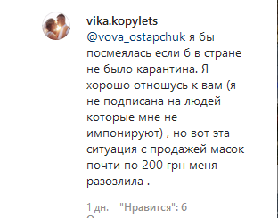 «Я бы посмеялась, если б в стране не было карантина. Я хорошо отношусь к вам (я не подписана на людей, которые мне не импонируют), но вот эта ситуация с продажей масок почти по 200 грн меня разозлила», – призналась пользовательница Сети.