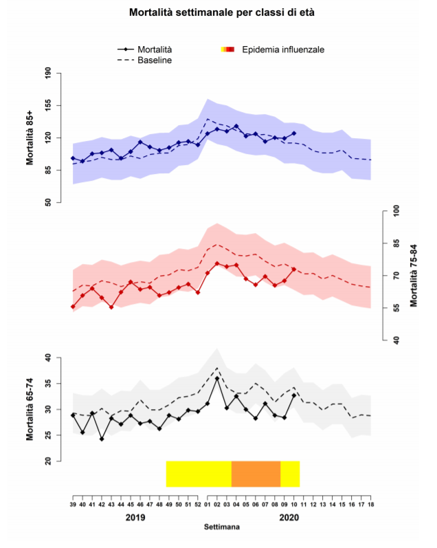 Как известно, летальность и смертность от коронавирусной инфекции различны в разных возрастных группах – в старших возрастах эти показатели выше. Графики из доклада Минздрава Италии от 7 марта 2020 г. свидетельствуют о том, что смертность в старших возрастных группах резко пошла вверх именно в последние недели: