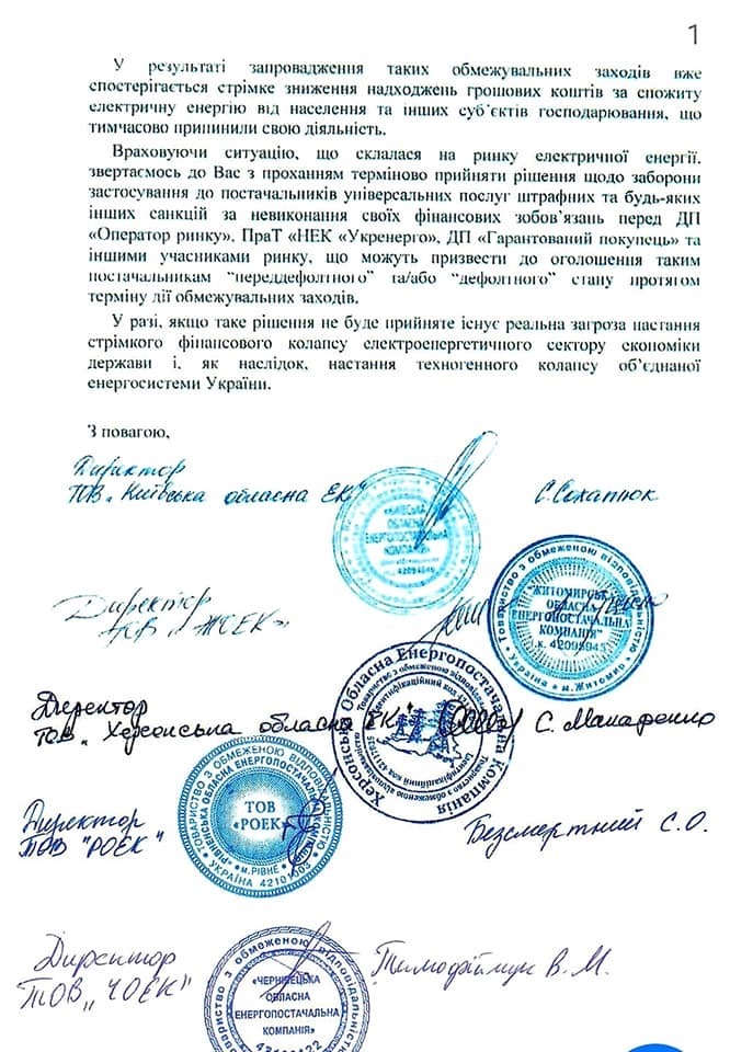 В связи с этим, украинские поставщики электроэнергии обратились к Президенту Украины с просьбой ограничить применение к ним штрафных санкций за невыполнение финансовых обязательств перед контрагентами ГП «Оператор рынка», ГП «Гарантированный покупатель», ЧАО «НЭК»Укрэнерго» и другими участниками рынка.