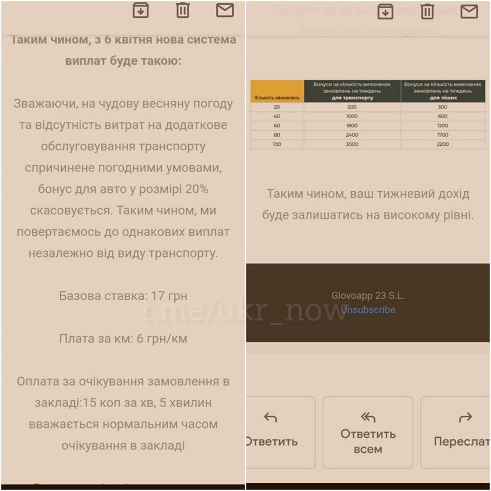 “Вместо 5000 грн за 100 выполненных заказов в неделю будет 3000 грн (минус 40%). Аналогично порезаны премии за 80, 60, 40, 20 заказов. Зато подняли стоимость километража с 5,50 грн до 6 грн за 1 км. Зарплата падает на 35% минимум”, – отметил один из курьеров Glovo.