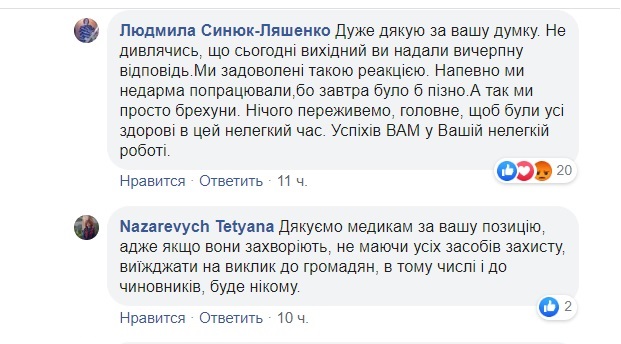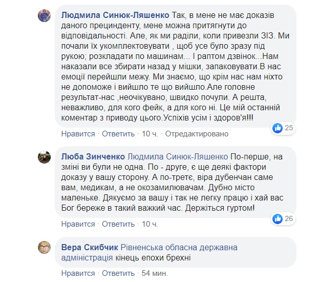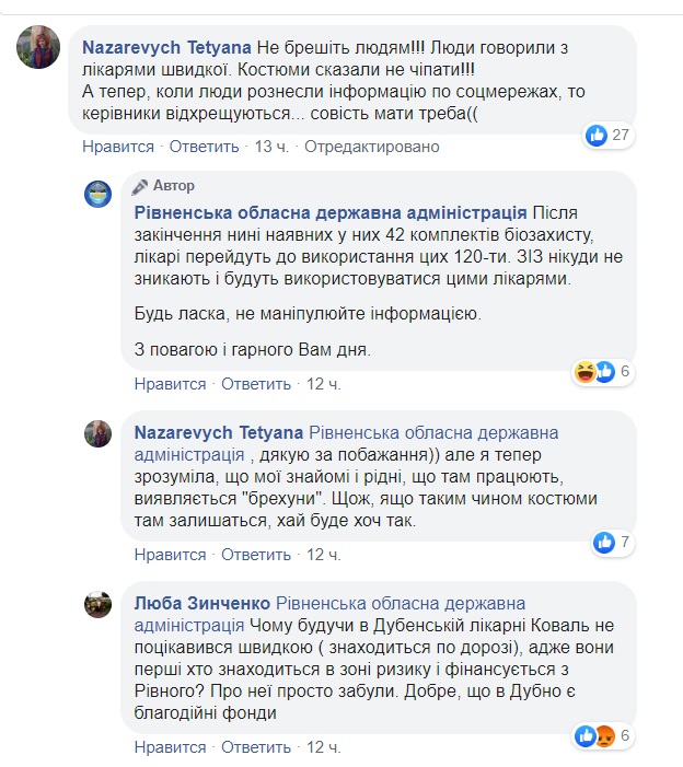 Вона заявила, що після виступу президента лікарня отримала 120 комплектів захисту. Далі в лікарню подзвонили з Кабінету міністрів і упевнилися, що вони отримали костюми. Однак пізніше керівництво області зажадало, щоб 50 комплектів були повернуті на базу. А ще через деякий час обласна влада зажадала, щоб на базу були повернуті всі костюми.