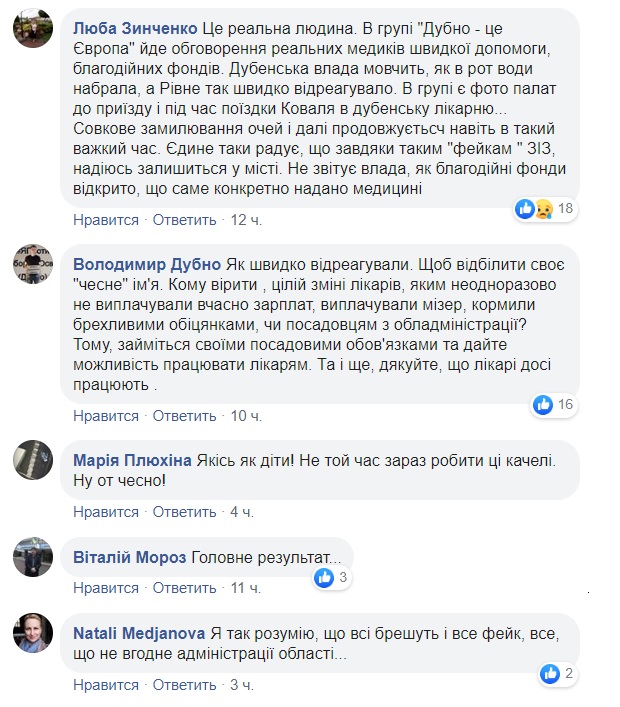 У лікарні міста Дубно, що на Рівненщині, стався скандал із захисними костюмами, які їм передали після виступу президента, а після дзвінка з Кабінету Міністрів зажадали, щоб всі костюми здали назад.
