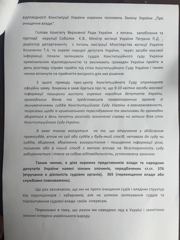 14 апреля Конституционный Суд Украины потребовал прекратить давление в связи с рассмотрением дела о конституционности Закона «Об очищении власти».