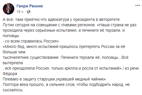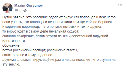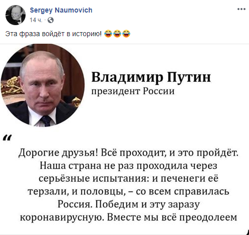 “Наша страна не раз проходила через серьезные испытания: и печенеги ее терзали, и половцы, — со всем справилась Россия. Победим и эту заразу коронавирусную. Вместе мы все преодолеем,” — сказал президент в своей речи в среду.