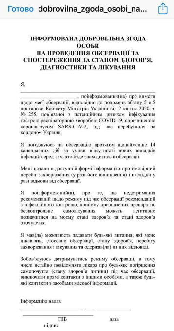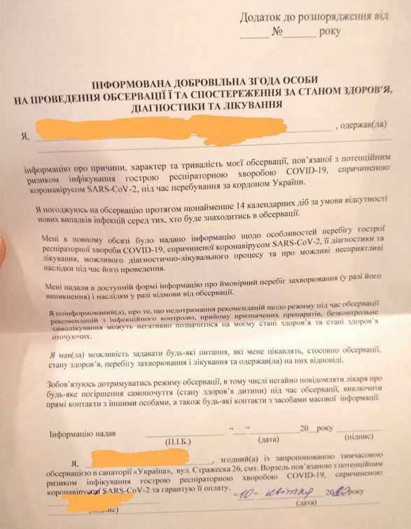 Перед посадкой всех заставили подписать бумагу о том, что они соглашаются на обсервацию в п.г.т Ворзель. Украинцам предоставили два варианта документа: в первом – речи об оплате обсервации не было, зато во втором варианте указали, что обсервация будет платной.