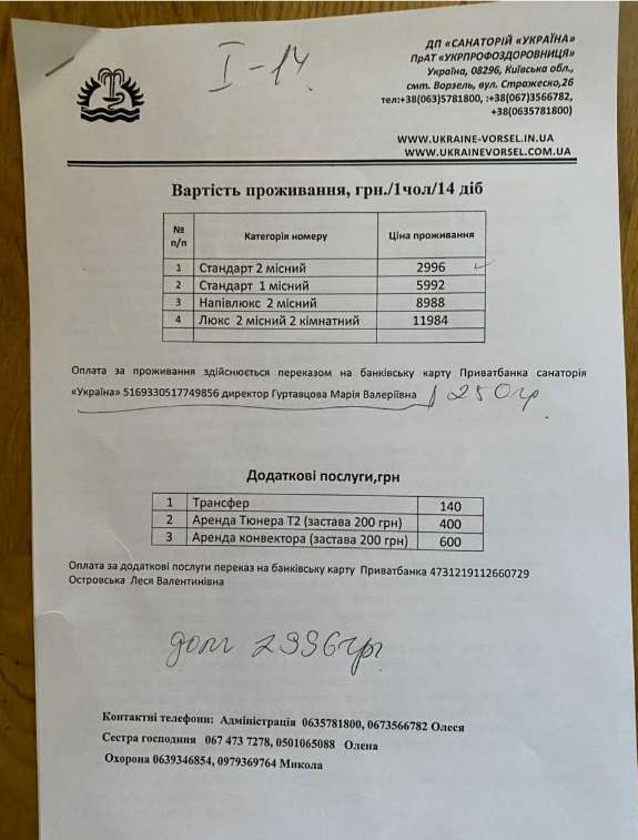 Всех эвакуированных заставили оплачивать и проживание, и питание, хотя постановление Кабмина говорит об обратном. По словам одной из пассажирок, после обращения группы к главе Киевской областной государственной администрации Василию Володину, он пригрозил им штрафом или выселением. Двухнедельное проживание и питание в санатории “Украина” стоит 7000 гривен, за холодильник и телевизор нужно доплачивать. “Мы начали ему (главе ОГА, – ред.) доказывать, он говорит – у вас нет вариантов, или вы будете оплачивать, или будете платить штраф, или остаетесь на улице. Сказал, у нас нет выбора и постановление нас не касается, потому что мы подписали бумагу. Мы платим и за еду, и за проживание в общей сложности 300 долларов. Для нас это ужас, потому что кто-то сидел в Дубае без денег. Если мы приехали из Дубая, это не означает, что у нас золотые горы. Мы очень сильно истратили там на содержание”, – говорит девушка.