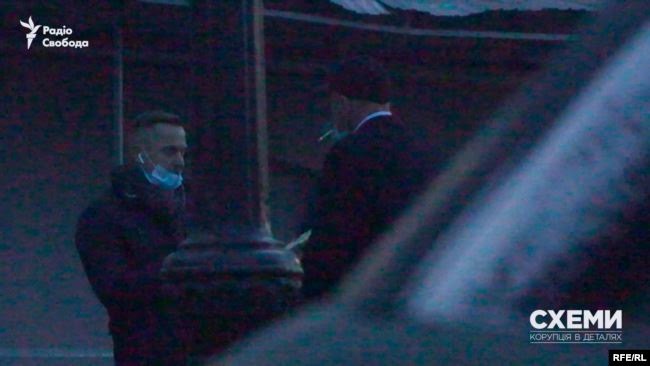 «Схемы» зафиксировали, как Чумак выходил оттуда в компании других мужчин. Один из них, с защитной маской на затылке, раздал всем небольшие коробки.