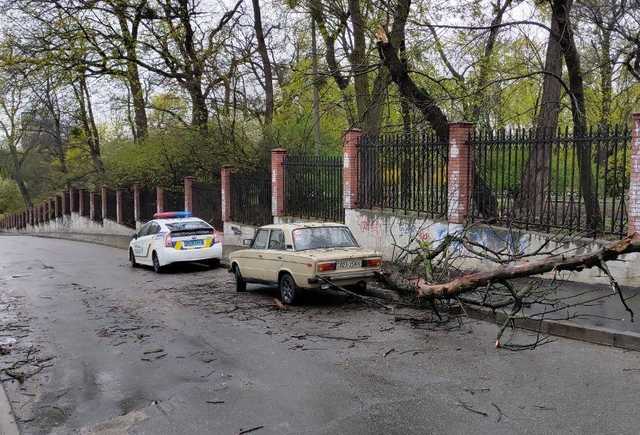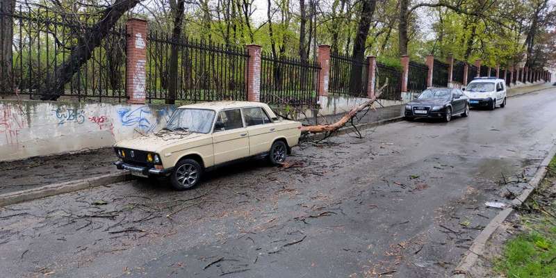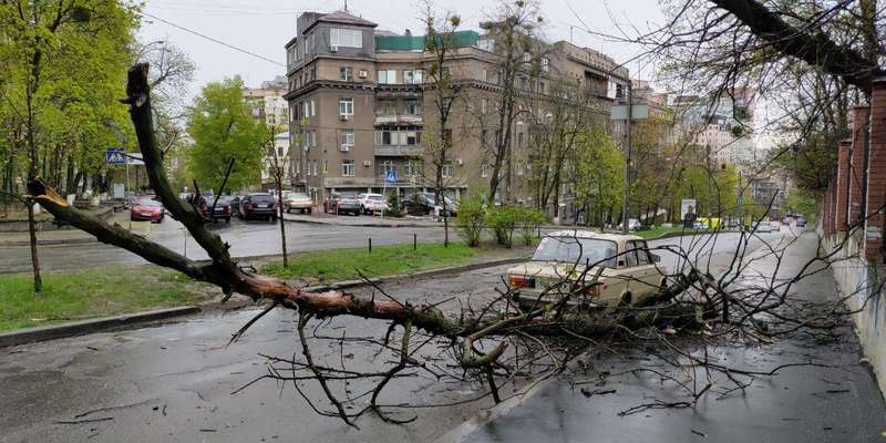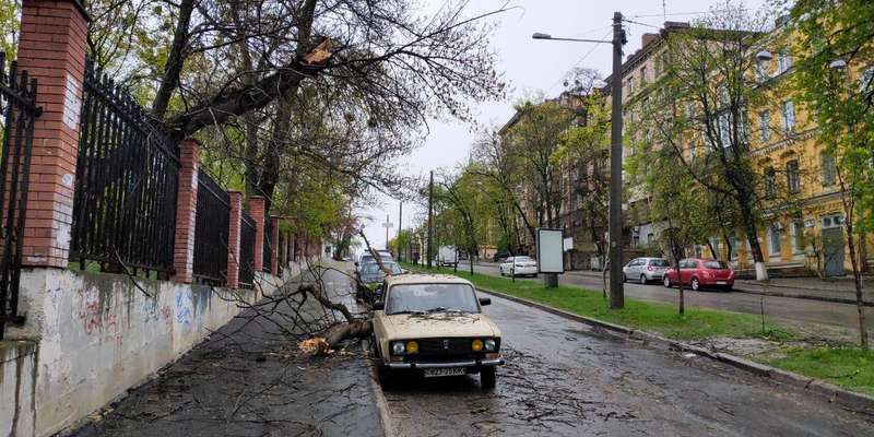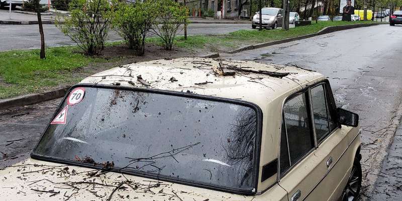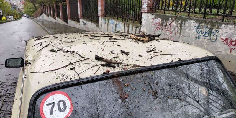 Стрімкі пориви вітру у Києві спричинили падіння гілок дерев на транспортні засоби, на щастя ніхто не постраждав.