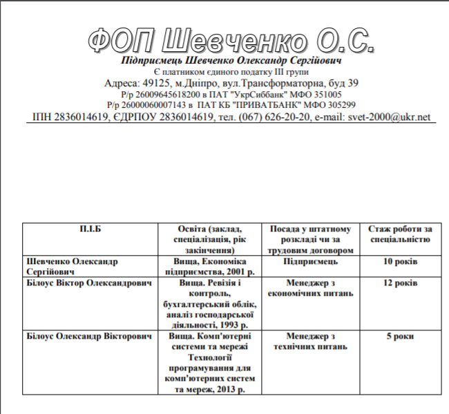 Так, в системе Prozorro мы нашли документы от 2018 года, в которых указанно, что Александр Шевченко является сотрудником ООО «Днепр Инвест Пром», а руководитель и соучредитель «Днепр Инвест Пром», в свою очередь, указан как сотрудник ФЛП Шевченко Александр Сергевич.