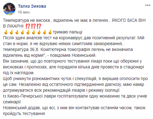 “В соответствии с требованиями Минздрава о проверке контактов людей, у которых выявлен COVID-19, сегодня прошёл тестирование. После сдачи анализов тест на коронавирус дал положительный результат. Моё состояние в норме, я не ощущаю никаких симптомов заболевания, температура 36,8. Компьютерная томография лёгких не определила отклонений от нормы. До повторного тестирования врачи пока осторожны в выводах и прогнозах, но посоветовали несколько дней провести в стационаре под их наблюдением. Во избежание разного рода кривотолков и спекуляций я решил объявить об этом сам”.
