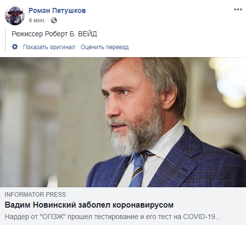 Пользователи украинского сегмента Facebook в большинстве своем позитивно восприняли новость о наличии коронавируса у адепта “русского мира”.