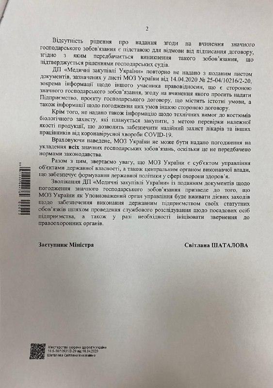 Государственное предприятие “Медицинские закупки Украины” согласовывая закупку защитных костюмов для медиков, не предоставляет Министерству здравоохранения необходимые документы, которые бы подтверждали их качество. Об этом свидетельствует письмо заместителя министра здравоохранения Светланы Шаталовой на адрес ГП, передает УНН.