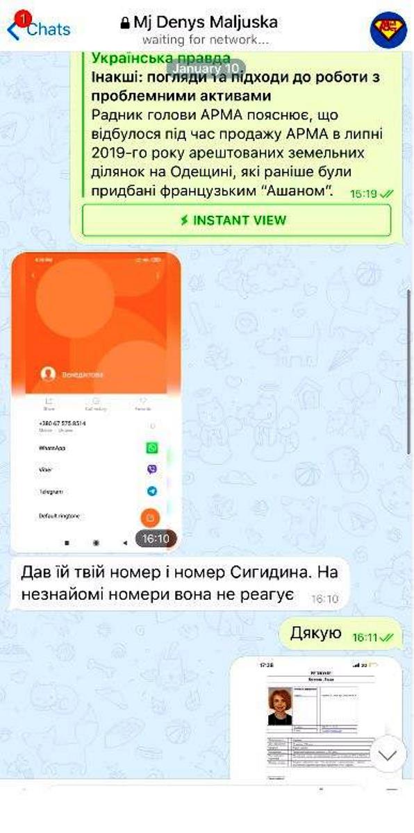Судя по переписке, Денис Малюська в январе поделился с на тот момент и.о. директора Государственного бюро расследований Ириной Венедиктовой телефонами Виталия Сигидина и Владимира Павленко, фактически дав "зеленый свет" для их назначения в АРМА.