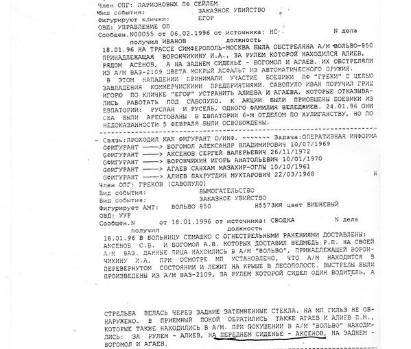 "Савопуло Иван поручил… устранить Алиева и Агаева, которые отказывались работать под Савопуло. К акции были приобщены боевики из Евпатории: Руслан и Русель, одного фамилия Веледжиев. 24.01.96 они оба были арестованы в Евпатории 6-м отделом по хулиганству, но по недоказанности 5 февраля были освобождены", – незатейливым языком свидетельствует милицейский агент.