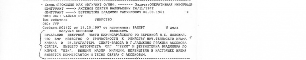 "Начальник дежурной части Бахчисарайского РО Бережной Н. К. доложил, что ему известно о причастности к убийству нач.теплосети Крыма Кузина и гл.бухгалтера спиртозавода в г.Ладыжино граждан Аксенова Сергея, бывшего авторитета ОПГ "Греки", и Беренштейна Вадимира по кличке "Бэн". Бывший майор милиции, Беренштейн в настоящее время является коммерсантом и тесно связан с Аксеновым", – гласит очередное донесение от октября 1997 года.