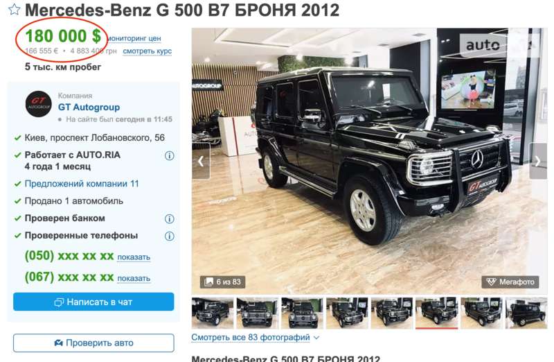 Даже в стандартной версии этот автомобиль стоит космических для украинцев денег, от 150 тыс $ в новом кузове. На сайте auto.ria мы нашли объявление о продаже такого же Мерседеса, 2012 года выпуска в бронированной версии - цена 180000 $, то есть по сегодняшнему курсу, это почти 5 миллионов гривен!