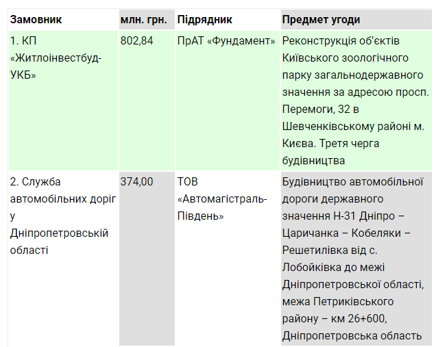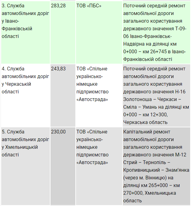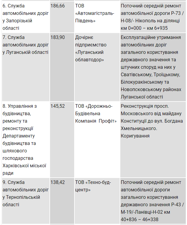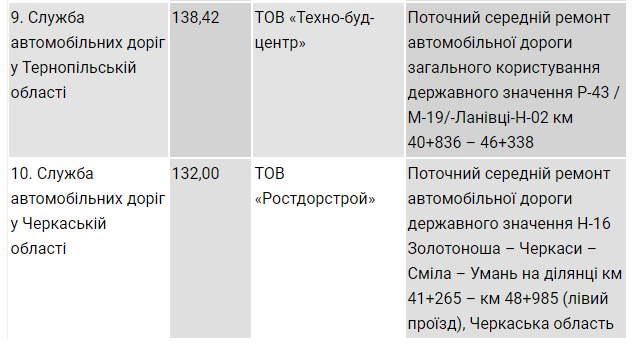 Из первой по размеру сотни сделок на сумму 5,72 млрд грн. почти три десятка договоров стоимостью 2,80 млрд грн касающиеся ремонта дорог Укравтодора и местных органов власти.
