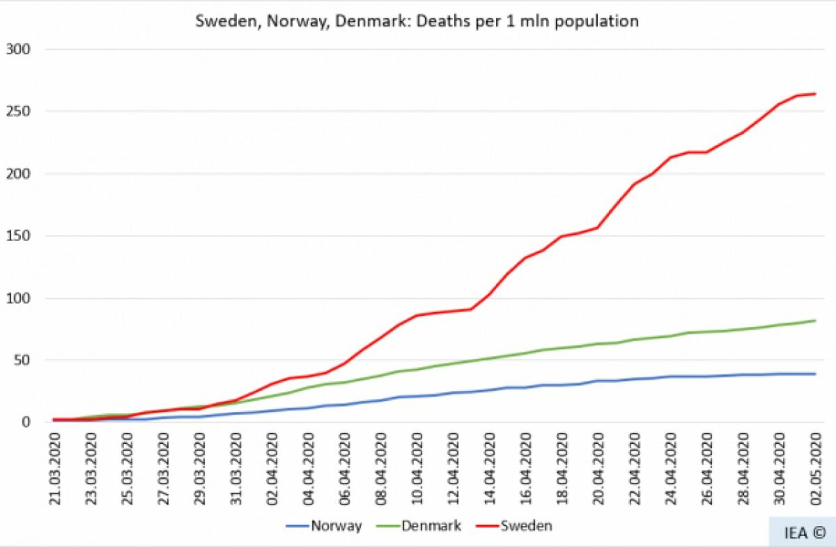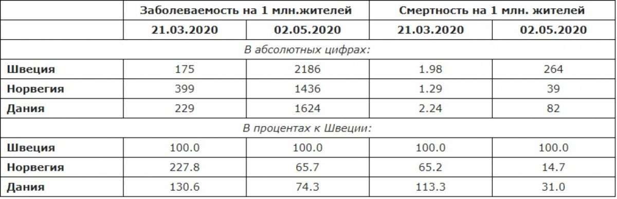 Смертность в Швеции на 21 марта превышала уровень Норвегии примерно в полтора раза, на 2 мая она превысила его уже почти в 7 раз. На начало периода смертность в Швеции была ниже датской на 13%, на конец периода она превышала его уже более чем в три раза.