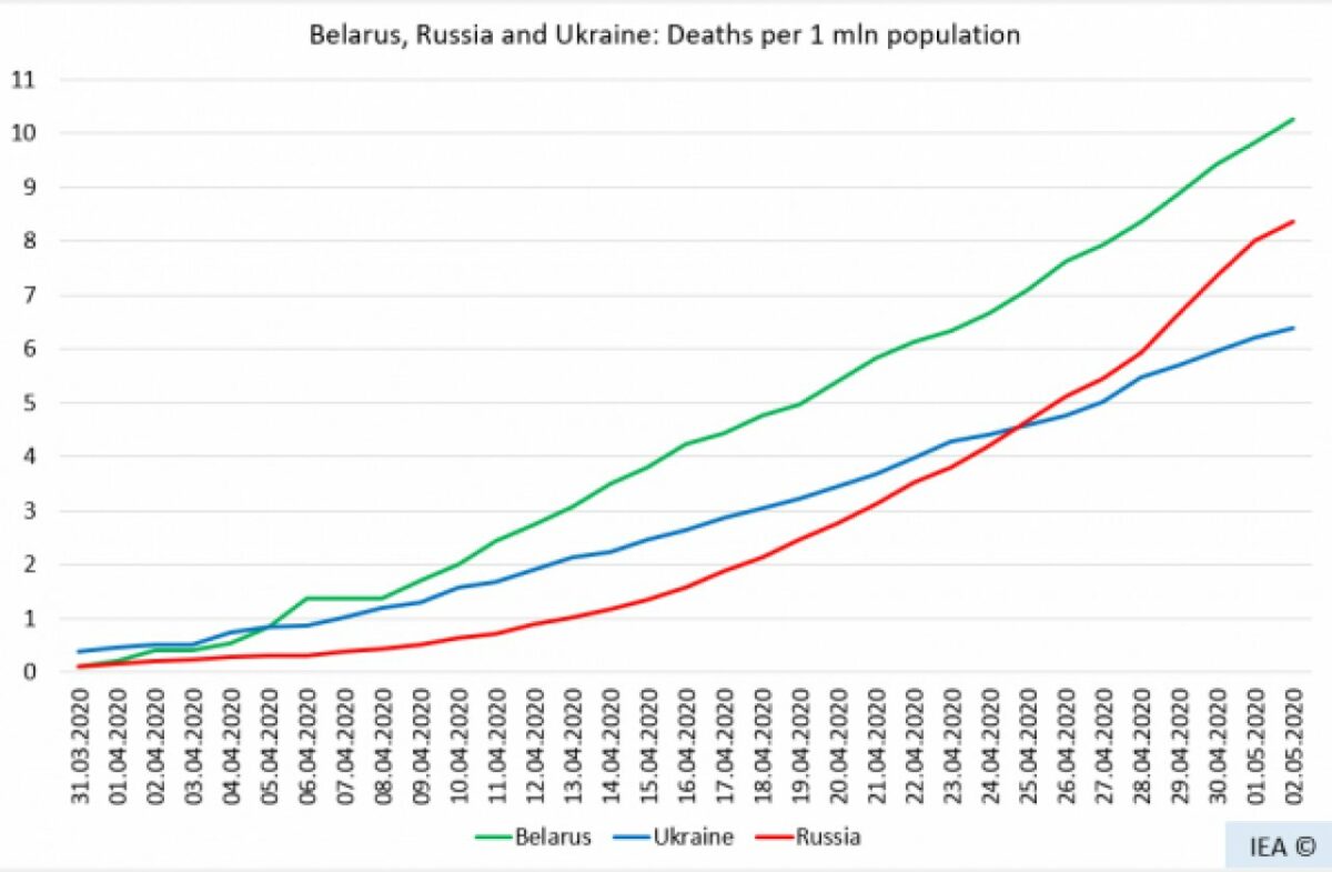 На 31 марта смертность в Беларуси была практически такой же, как в России (0.11 — 0.12 погибших на 1 млн жителей) и почти вчетверо ниже, чем в Украине. На 2 мая в Беларуси смертность почти на пятую часть (на 18,4%) превышает российский показатель и более чем на треть (на 37,9%) — украинский.