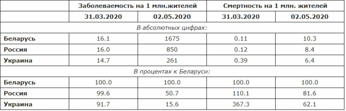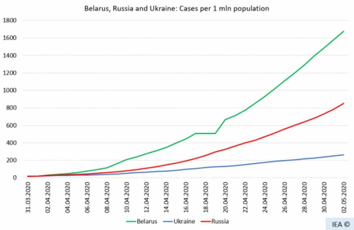 На 31 марта заболеваемость в Беларуси была практически такой же, как в России и Украине — в пределах 14,7 — 16,1 заболевших на 1 млн жителей. На 2 мая заболеваемость в Беларуси уже вдвое превышала российский уровень и более чем в 6 раз — украинский.