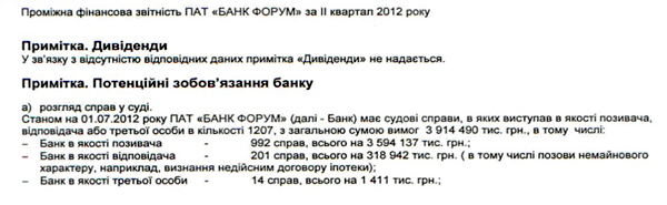 На 1 июля 2012 года его убыток составлял рекордные для системы 4,6 млрд гривен. Кроме того "Форум" не скрывал, что уже тогда пытался отсудить у заемщиков 3,6 млрд гривен задолженности по кредитам. Очевидно, что речь шла о безнадежных долгах. Тогда весь кредитный портфель банка был равен 6,2 млрд гривен.