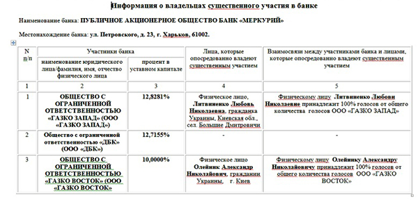 Крупными акционерами "Меркурия" по данным самого банка числятся ООО "Газко Запад" (12,8% акций), ООО "ДБК" (12,7%) и ООО "Газко Восток" (10,0%). Все эти компании не имеют собственных сайтов, и записаны на людей, не известных поисковикам. Исключение составляет "Газко Восток". Владельцем этой компании является Александр Олейник.