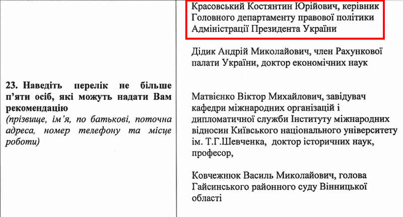 Цікава деталь – в анкеті Капуша серед осіб, які можуть надати рекомендацію, вказаний Красовський Костянтин Юрійович. Він працював керівником департаменту в адміністрації президента Петра Порошенка та подавався за його квотою у Вищу раду правосуддя.