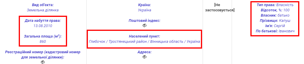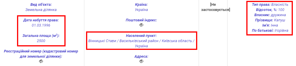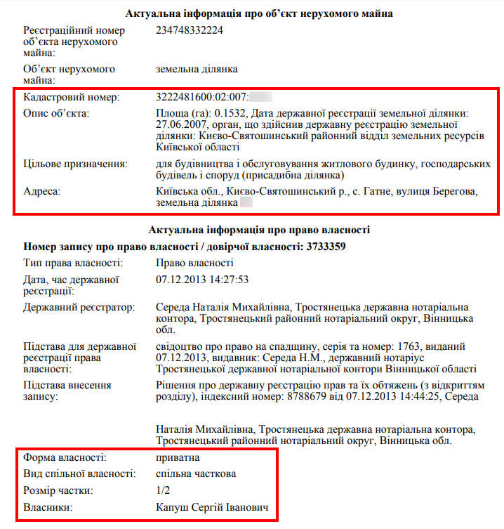 В Івана Капуша також вже є декларація за попередній рік. У ній суддя показує три земельні ділянки, що належать батьку та дружині. Одна з них площею 0,25 га розташована у Васильківському районі на Київщині та записана на Інну Капуш. Наступна з’явилася уже в батька на Вінниччині. Там він отримав 0,08 га.