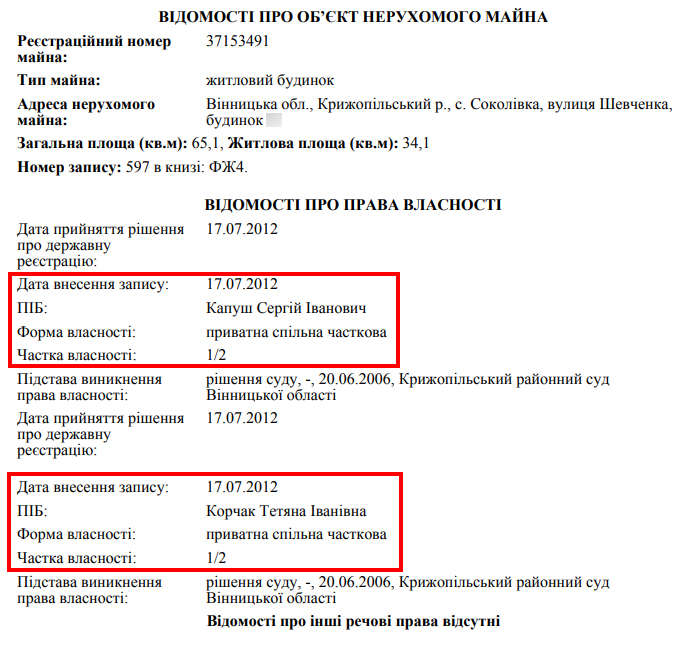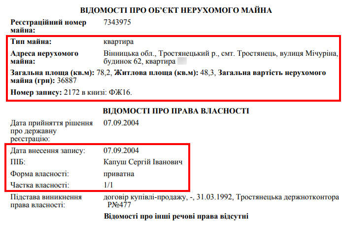 Капуш-молодший, як чинний суддя, також вписав у свою декларацію батькову квартиру в Тростянці. Там у нього є 75.2 кв. м житлової площі. А от половину будинку в Крижопільському районі, який у нього є з 2006-го – забув.