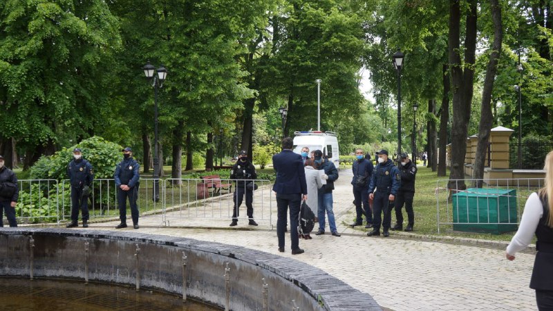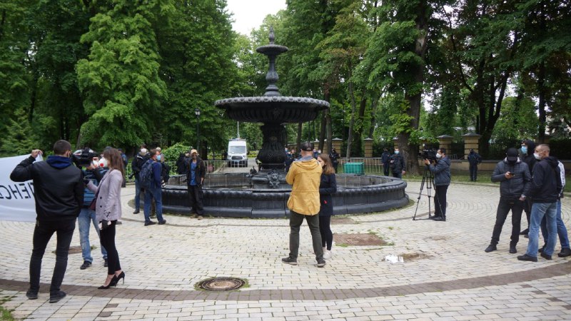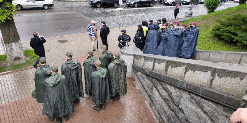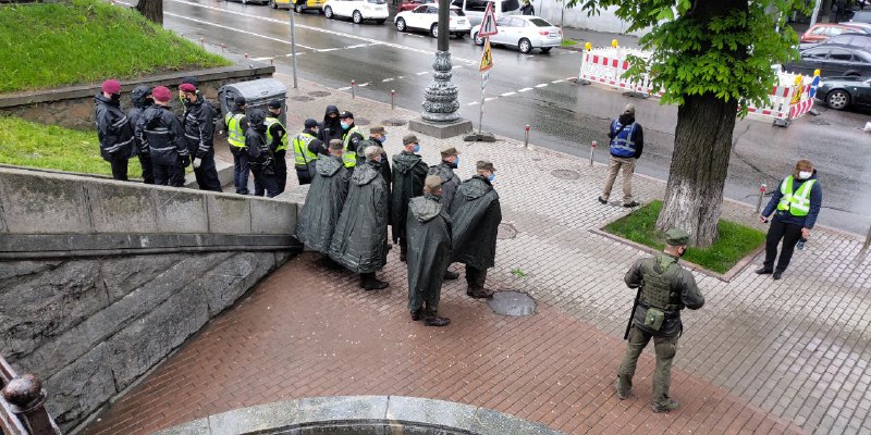 UPD: Сильна злива розігнала протестувальників. Наразі вхід до Маріїнського парку з боку вулиці Садової повністю перекрито правоохоронцями.