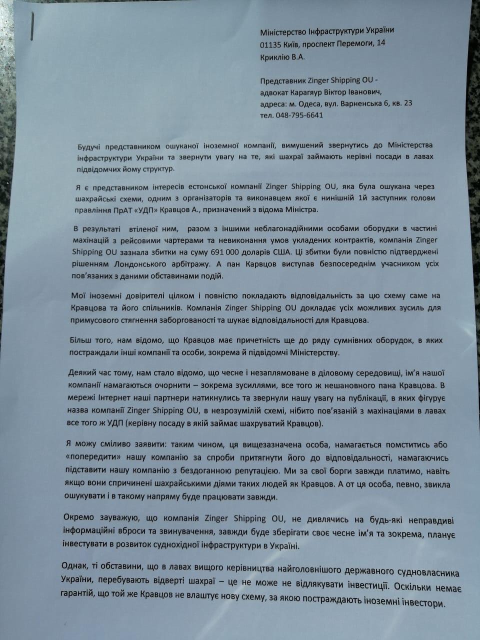 «Враховуючи зазначене, у нас є запитання до міністра: чи відомо вам про незадовільну ділову репутацію першого заступника голови правління УДП А.Кравцова? Якщо невідомо — велике питання, чому, адже в цієї особи жахлива ділова репутація серед судновласників і це свідчить про погану перевірку кадрів у вашому міністерстві. Якщо відомо — просимо пояснень, як така особа може обіймати таку відповідальну посаду? Чи вигідно вам мати шахраїв серед керівництва УДП, а можливо, пан Кравцов займається розкраданням з вашого відома?», — написано у зверненні.