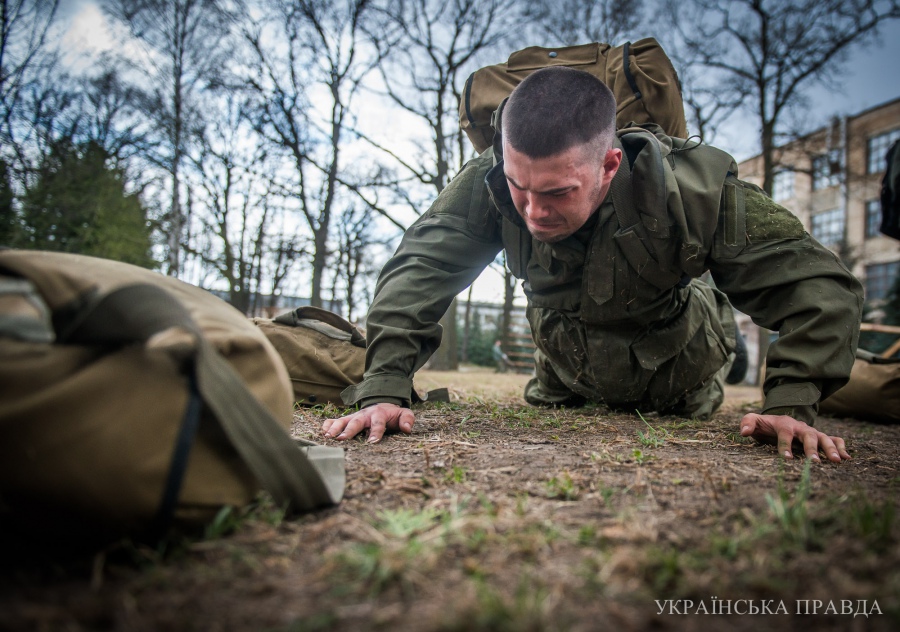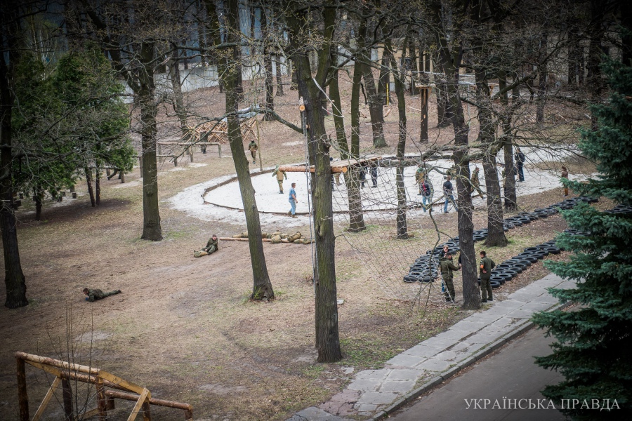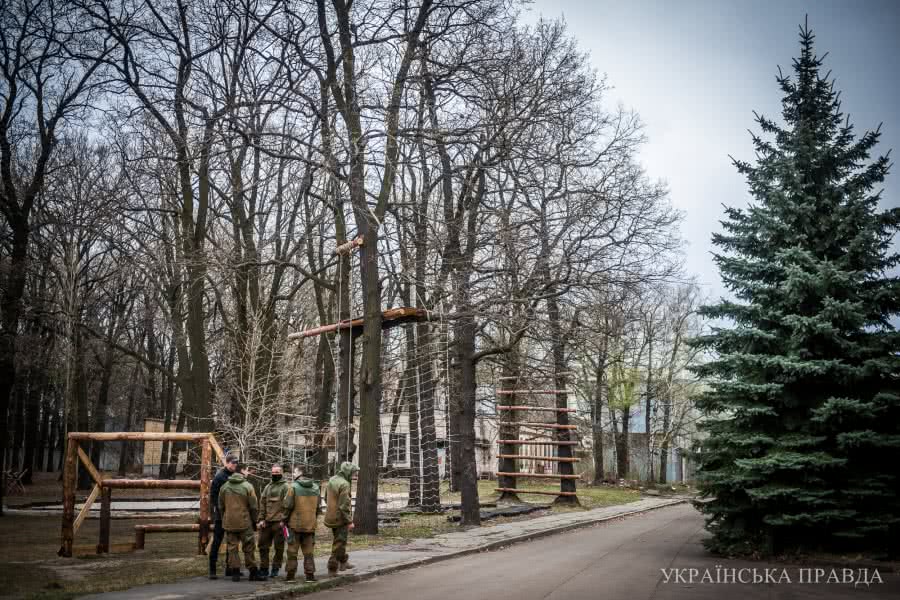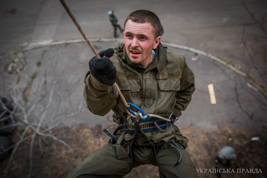 Есть на экзамене и альпийская подготовка. Претенденту необходимо на тросе спуститься с 4-го этажа заводского корпуса. Здесь помогают волонтеры. Каждые выходные киевляне, которые занимаются скалолазанием, приезжают в лагерь обучать солдат.