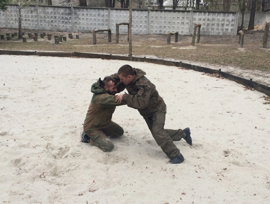 Заключительное испытание – 6-минутный рукопашный бой с одним из инструкторов "Азова". Борьба идет на самодельном песчаном ринге. Его выкопали сами новобранцы и засыпали белым песком за две ночи в качестве наказания за какие-то проступки.
