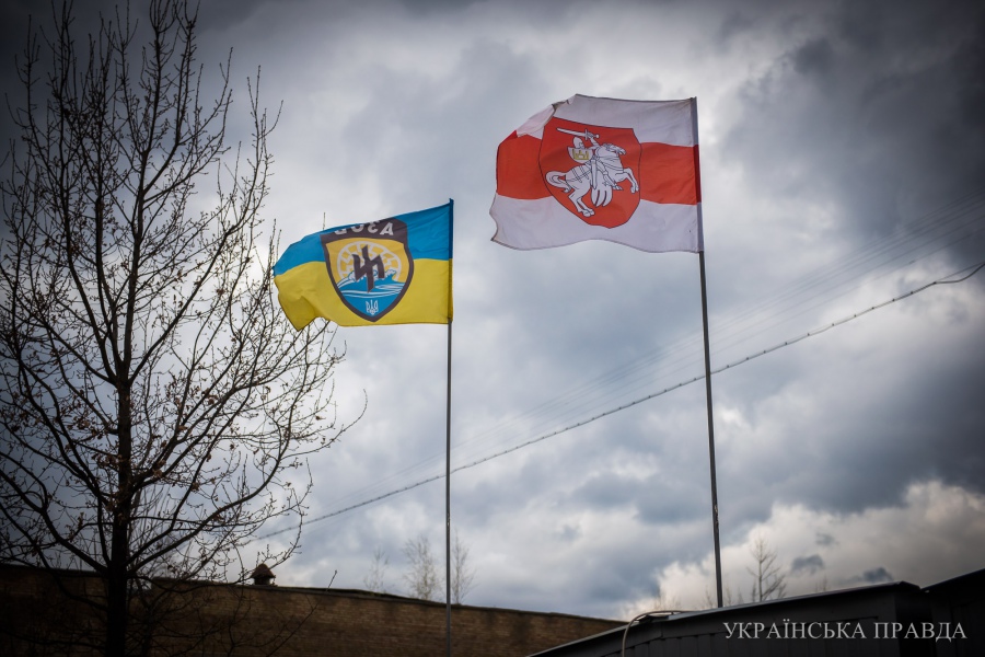 В лагере с новобранцами работает 6 молодых инструкторов из Беларуси. Они воют в "Азове" с лета прошлого года. Поэтому над лагерем развевается два флага - "Азова" и бело-красно-белый белорусский флаг.