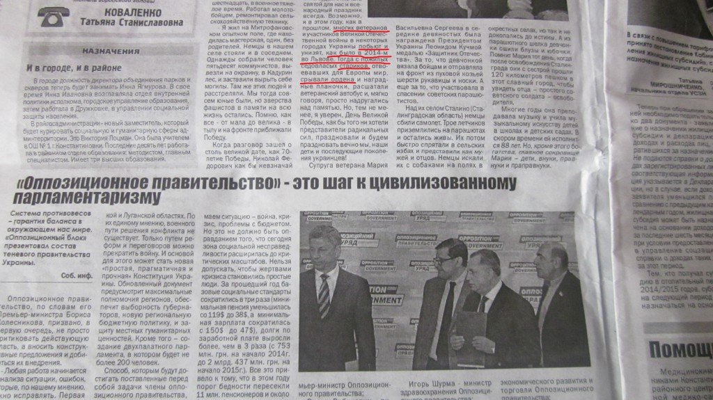 Пропаганду ненависти чиновники сеют через вышеупомянутый печатный орган. В выпуске от 9 апреля 2015 года в "Знамени индустрии" вышла статья, в которой намеренно подается недостоверная информация. В публикации "Будем праздновать всегда"  газета "регионалов" утверждает, что в Украине собираются "отменить День Победы". Это утверждение не соответствует действительности, так как еще 24 марта министр культуры Вячеслав Кириленко официально заявил, что никто не собирается отменять в Украине советский праздник, а лишь предлагает отмечать его два дня.