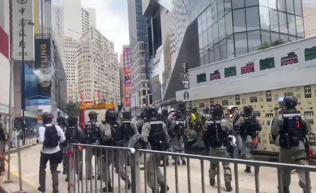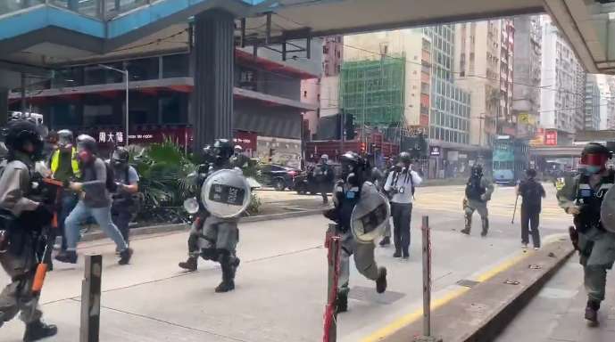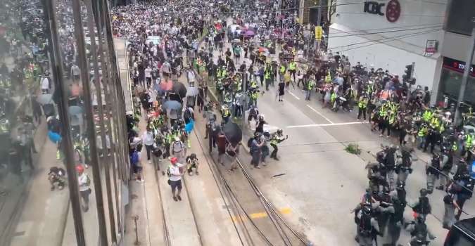 Гонґ-Конґ сьогодні. Анти-пекінські протустувальники зібрались на недозволений мітинг, частина з них почала тіснити невеличку групу поліції, кидаючи в них усе, що потрапило під руку