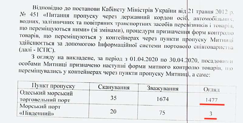 Учитывая, что досмотровая рампа и грузчики там сданы в аренду частной фирме, количествово досмотров именно в Одесском порту просто “зашкаливает”. К примеру, сводка за апрель 2020 года ниже. При сопоставимых объемах погрузки контейнеров, досмотров в Одесском порту в 500 раз больше, чем в порту Пивденний, что в 40 километрах от первого. Разве это не достойный повод для вмешательства СБУ в работу госпредприятия, хотя бы для выяснения происходящего? А ведь именно такая “странная разница" была побудительным мотивом для самого большого контейнерного перевозчика мира - датской компании Maersk - покинуть надолго (если не навсегда) Одесский порт. А ведь в один из терминалов Одесского порта, построенного якобы специально под Maersk, вбухали почти 1 млрд. долларов государственнызх средств! Зачем? Чтобы руководство порта годами потворствовало схемам с досмотрами, Евротерминалом, проваленным волноломом и т. д.?