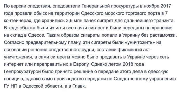 Груз сигарет через год бесследно растворится в череде складов без таможенного обеспечения, будет лихо и тихо продан за наличные “служивыми”. В идеале на складе для хранения останутся только пустые коробки с бирками и надписями о хранившихся когда-то там сигаретах. Кто хочет, может взять дело на контроль! Так и будет, не пройдя и года. Не раз уже было, схема хищения чужих грузов в Украине людьми в погонах отработана до мелочей! В схему вовлечены даже генералы и высочайшие прокуроры, так “вкусно тема работает” - это вам не простые полковники СБУ “в свободном поиске” в портах мародерят: