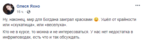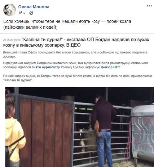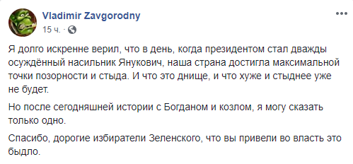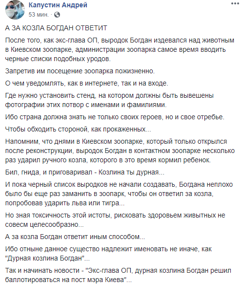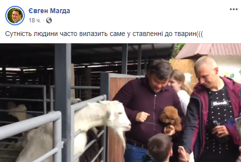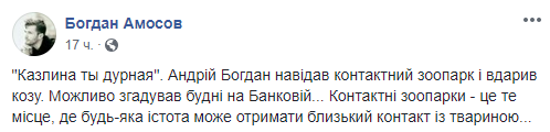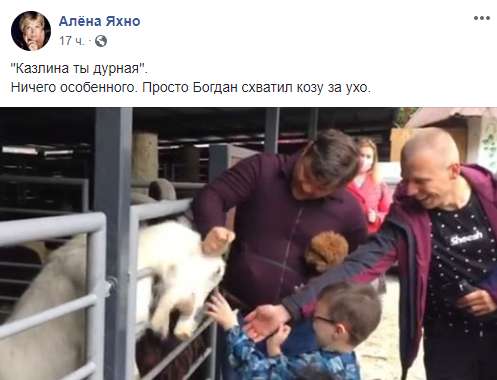 Во время “общения” с козлом у Богдана возник конфликт. Животное выхватило целый стакан с овощами у ребенка, который стоял близко к ограде, после чего Богдан схватил козла за ухо и заставил вернуть стакан ребенку. Затем экс-глава ОП щелкнул животному по уху со словами “Козлина ты дурная”. После этого он смеется, затем фотографируется с животным, а потом садит козлу на спину свою собачку.