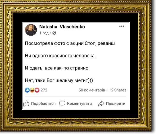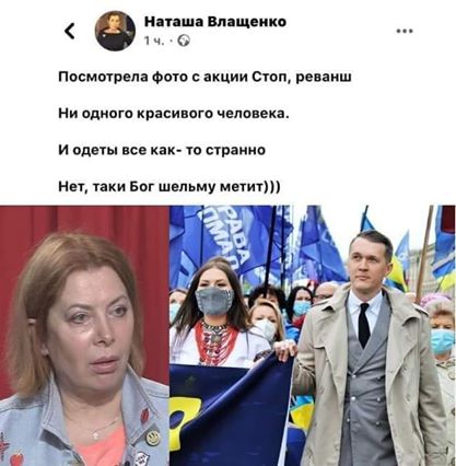 "Посмотрела фото с акции Стоп, реванш. Ни одного красивого человека. И одеты все как- то странно. Нет, таки Бог шельму метит)", - написала Влащенко у себя в Фейсбуке.