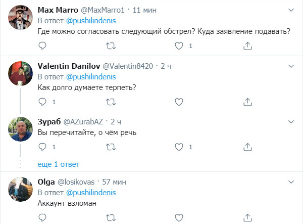Одни комментаторы пишут о том, что наконец-то Пушилин написал правду, другие уверены, что аккаунт взломан. В то же время на канале Пушилина в Telegram появилось заявление о том, что это был взлом. По информации «ФАКТОВ», за взломом стоят украинские спецслужбы.