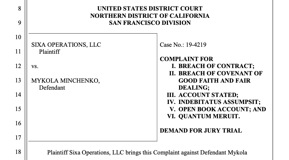 В июле 2019 компания Sixa Operations LLС в лице ее единственного менеджера Назара Банита подала иск против Николая Минченко, CEO Sixa Inc.