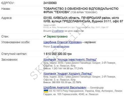 Действительно, изучив данные его предприятий, можно открыть, что подавляющее большинство из них записаны на кипрские оффшорные фирмы. Например, ТРЦ «Никольский» (в Харькове) принадлежит кипрской фирме «Никольский Холдингз Лимитед», его ООО «Фабрика Соляр» записана на кипрскую фирму «Atmasphera Holdings Limited», ну а «ТехНова» сразу на две кипрские фирмы (см. скриншот). И таких фирм на Кипре у Шкрибляка много, похоже, что они являются эдакими оффшорными прокладками, «клеящимися» на каждое его украинское предприятие. При этом большинство этих фирм зарегистрированы по одному адресу: город Лимасол, Герматогейя 4041, офис 111, то есть рядом с кипрской квартирой Анатолия Шкрибляка.