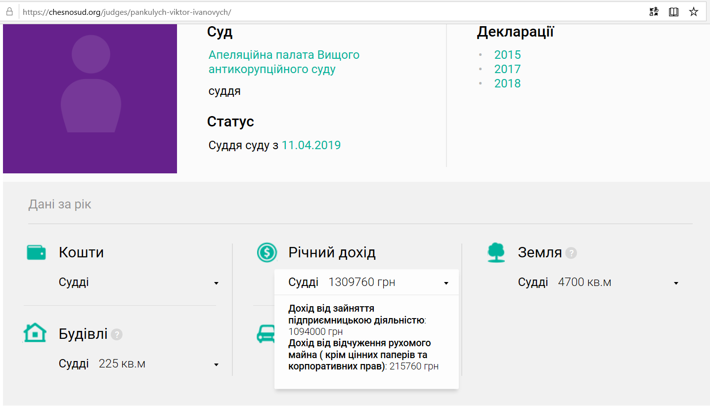 Состав более чем интересный. Возьмем к примеру, председателя Виктора Панкулича. По данным платформы "Чесно", судья активно занимается бизнесом! Хотя это является прямым нарушением закона. Виктор Панкулич является совладельцем ООО "Самоцвет", осуществляющего деятельность в сфере права. Также судья является конечным бенефициарным владельцем ООО "АСД-ИНВЕСТ", основным видом деятельности которого является оптовая торговля зерном, необработанным табаком, семенами и кормами для животных.